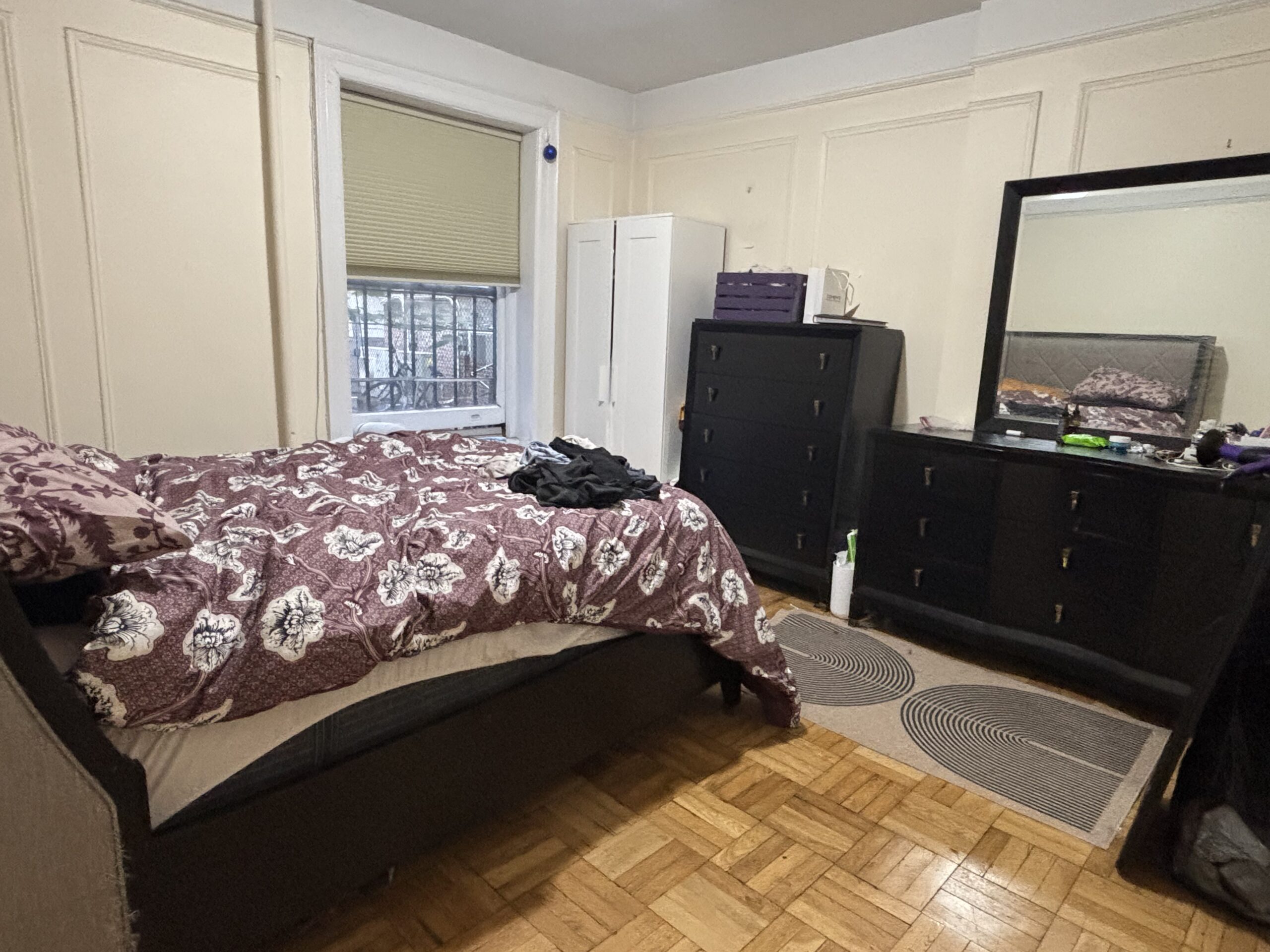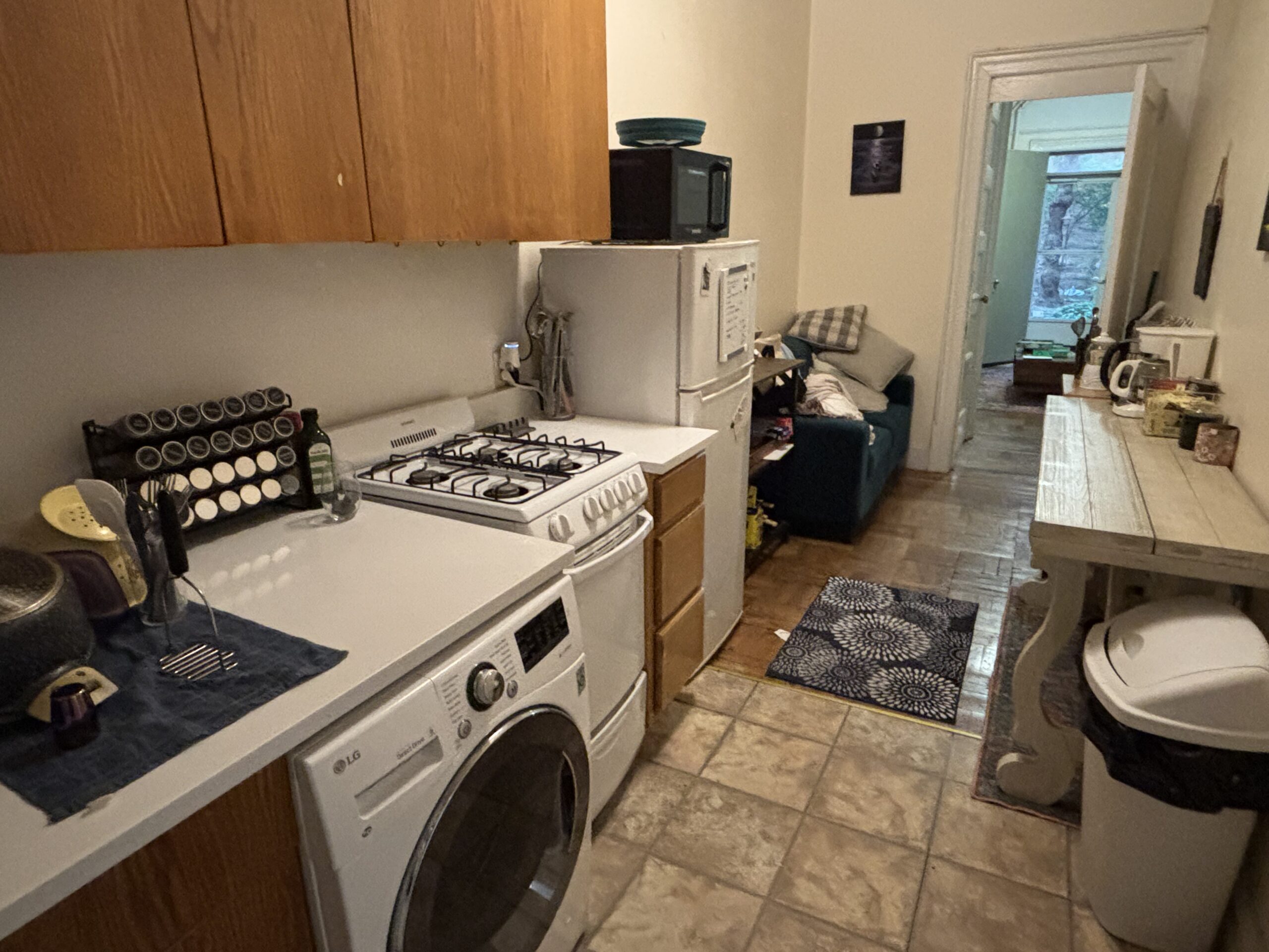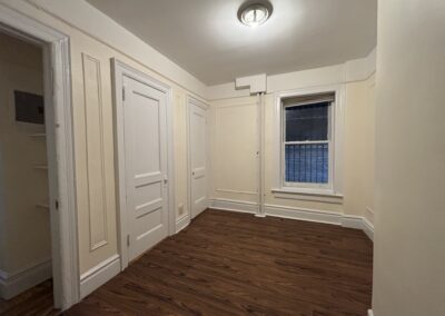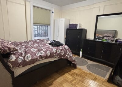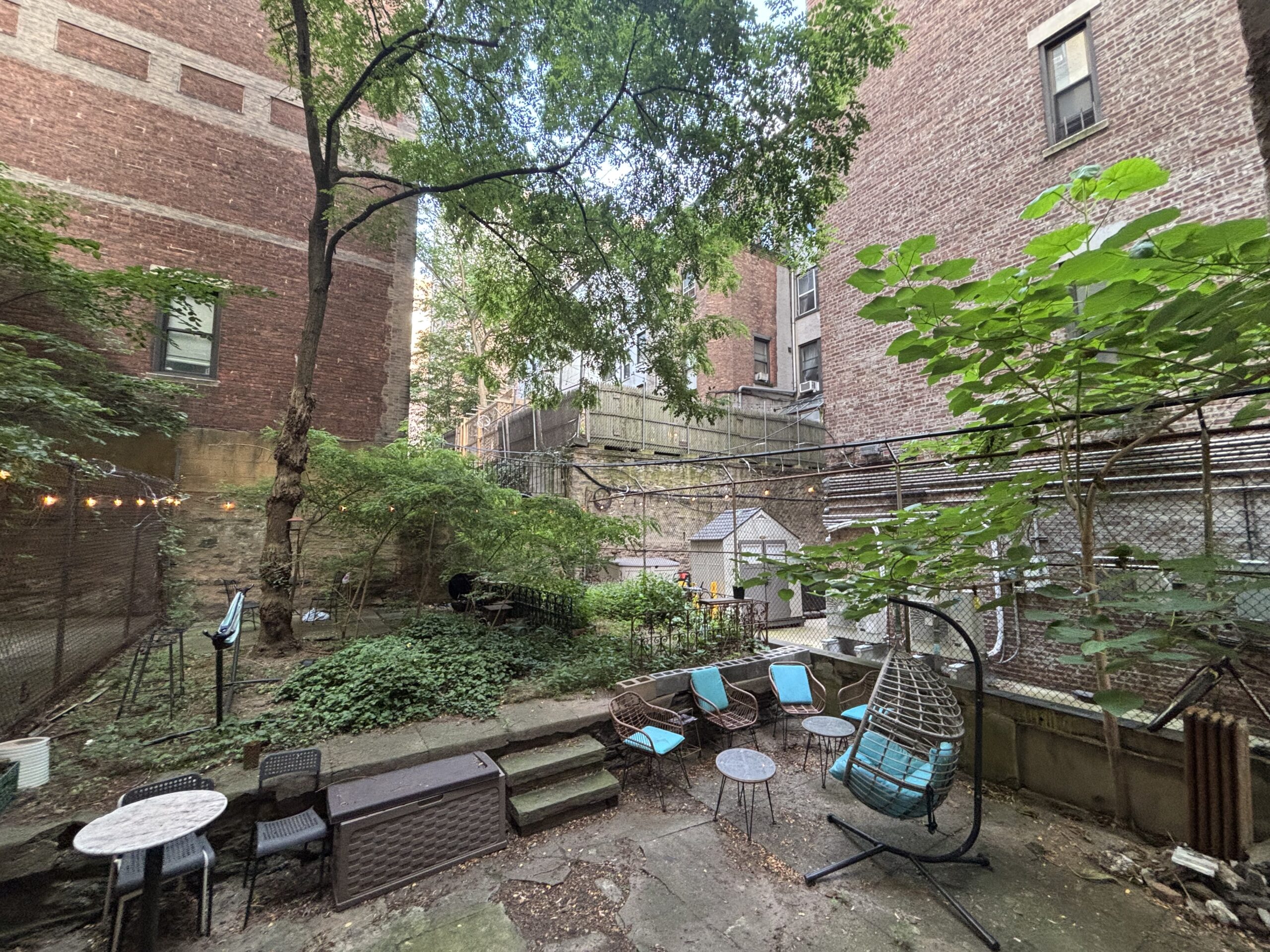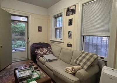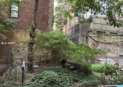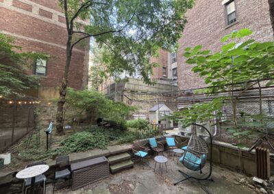This large three bedroom retreat is the garden apartment of our flagship limestone Riverside Drive mansion. Full bath, kitchen with living area and in-unit laundry, three well-isolated, large, well-lit bedrooms with a total of five windows/glass doors to the yard, a huge garden with raised beds, acres of daylight, this sweet and private place for three is just 30 seconds by foot from the elms of Riverside Park, and one block from Broadway.